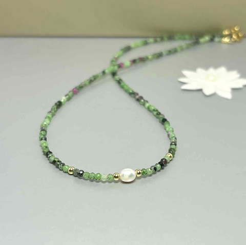 Colier minimalist rubin in zoisit, perla cultura si aur filat 14K