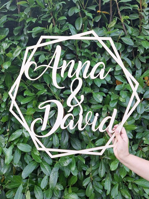 Atenție! Acest produs este disponibil numai pentru livrare la domiciliu! Un semn de nuntă elegant, personalizat, tăiat cu laser, care poate fi decorul perfect pentru fundalul mesei principale. Numele cuplului sunt decupate pe placa în formă de hexagon – cu un aspect curat și elegant, care se potrivește decorurilor de nuntă boho, rustice, vintage sau moderne. Alegerea perfectă: ca fundal în spatele mesei principale, în fața unui perete foto,