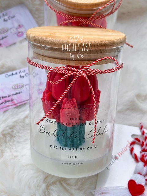 - Material: ceara de soia, fitil, recipient sticla, capac bambus