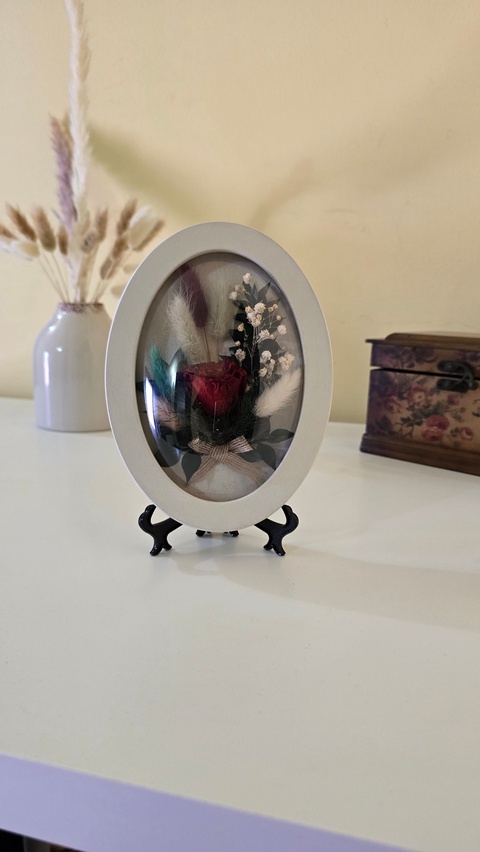 - Material: rama din lemn, sticla acril bombata, flori naturale criogenate/stabilizate
