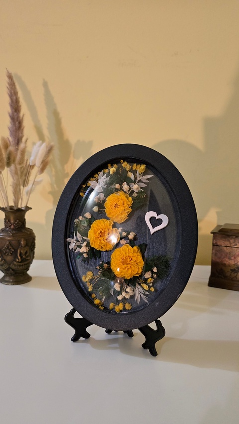 - Material: rama ovala din lemn, sticla acril bombata, flori, flori naturale criogenate