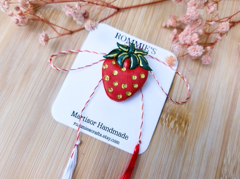 Mărțișor Broșă Căpșună – Lucrat Manual din Lut Polimeric, 2x4 cm