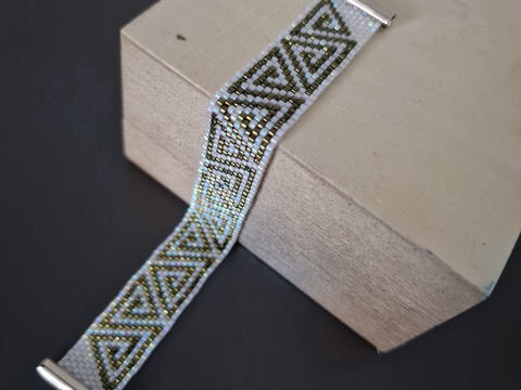 Brățară Elaya – Miyuki Handmade Alb Sidefat și Verde Măsliniu, Model Grecesc Geometric