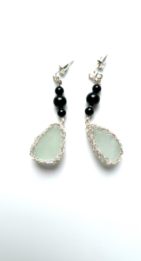 Cercei unicat argintati cu sticla de mare si agat negru