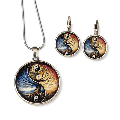 Set bijuterii Yin Yang si Copacul Vietii argintiu cu cabochon de sticla 204800
