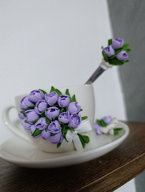 Set decorativ handmade-cana cu buchet de lalele lila, farfurioara si lingurita asortata