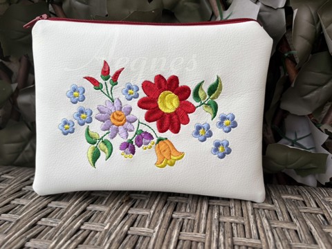Geantă cosmetică din piele textilă albă cu model Kalocsa. Broderia este cusută la mașină și întărită cu rigidizator pentru o mai bună susținere. Dimensiunile genții cosmetice: lățime: 18 cm, înălțime: 12 cm. Căptușeală: pânză de bumbac cu model.
