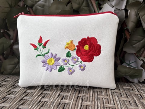Geantă cosmetică din piele textilă albă cu model Kalocsa. Broderia este cusută la mașină și întărită cu rigidizator pentru o mai bună susținere. Dimensiunile genții cosmetice: lățime: 18 cm, înălțime: 12 cm. Căptușeală: pânză de bumbac cu model.