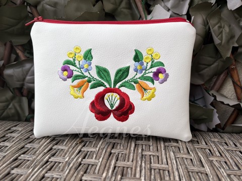 Geantă cosmetică din piele textilă albă cu model Kalocsa. Broderia este cusută la mașină și întărită cu rigidizator pentru o mai bună susținere. Dimensiuni geantă cosmetică: lățime: 18 cm, înălțime: 12 cm. Căptușeală: pânză de bumbac cu model.