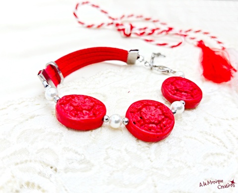 - Material: oțel inoxidabil, cinabru, suede, perle tip mallorca