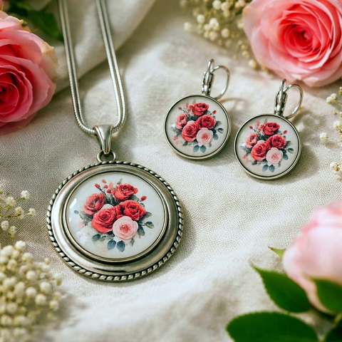 Set bijuterii colier si cercei cu trandafiri argintiu 200500