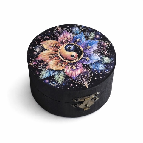 Cutie rotundă din lemn cu simbol Yin Yang si mandala – 223900