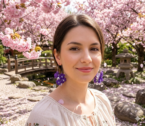 Cercei handmade, lungi cu flori mov si perle lila (cod1396)