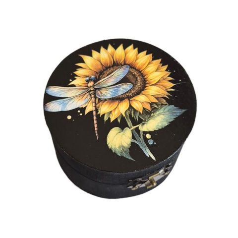 Cutie rotundă din lemn cu libelula si floarea soarelui - 103550