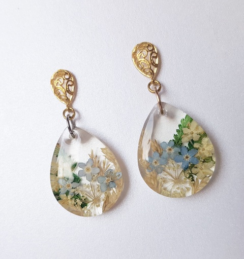 Cercei lacrima cu flori verzi si albastre naturale cercei din rasina cercei cu flori de nu-ma-uita cercei hippie