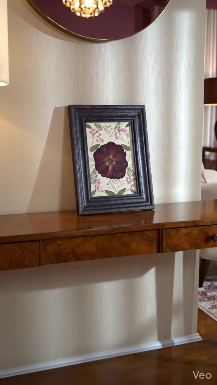 Tablou Botanic Handmade – Trandafir Burgundy, Gypsophila și Ferigă Ramă Lemn, Protecție Sticlă 20X25 cm