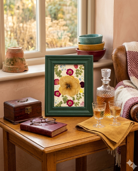 Tablou Botanic cu Flori Presate și Ramă Verde