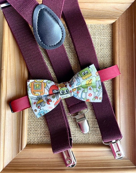 Set pentru copii, papion cu robotei si bretele bordeaux