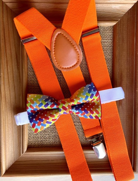 Set pentru copii, papion curcubeu si bretele portocalii neon