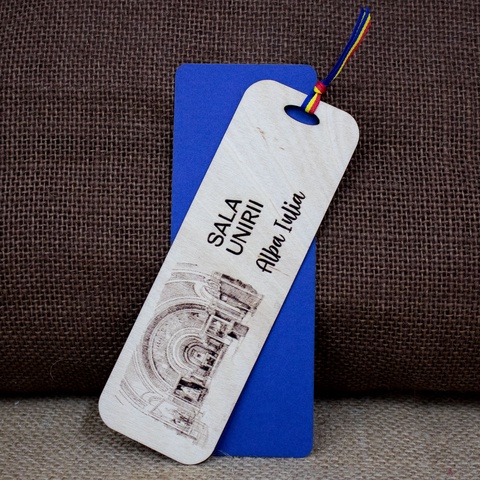 Semn de carte suvenir din lemn, gravat, Sala Unirii, Alba Iulia