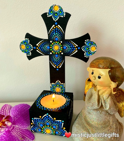 Candela " cruce" personalizabila, pictata manual in tehnica mandala dots