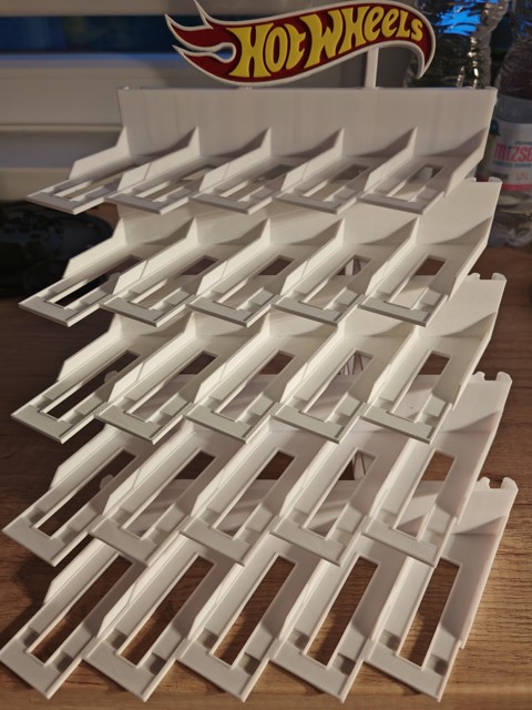 Realizat cu ajutorul imprimării 3D, pentru depozitarea a 25 de mașinuțe, în 5 rânduri, câte 5 mașinuțe pe rând. De asemenea, puteți solicita un set mixt (2 înclinate spre stânga, 3 înclinate spre dreapta) și în culori diferite.