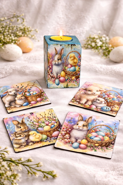 Set cadou de Paște , suport lumânare din lemn decorat manual + suporturi pahare cu iepurași 01906