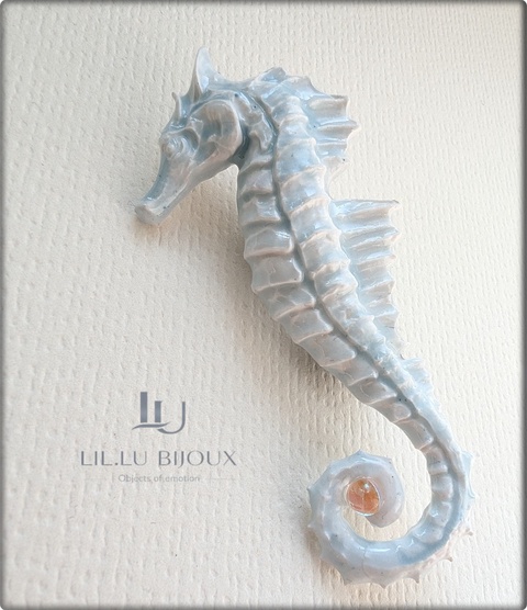 Broșă căluț de mare albastru deschis, aspect porțelan, accesoriu elegant de purtat pe partea stângă