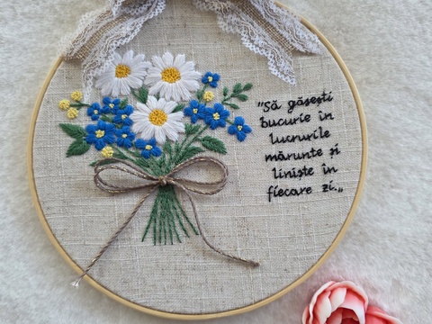 Tablou brodat manual cu flori de câmp și mesaj inspirațional