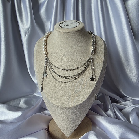Colier din perle de cultură și hematite, cu lanțuri din oțel inoxidabil.