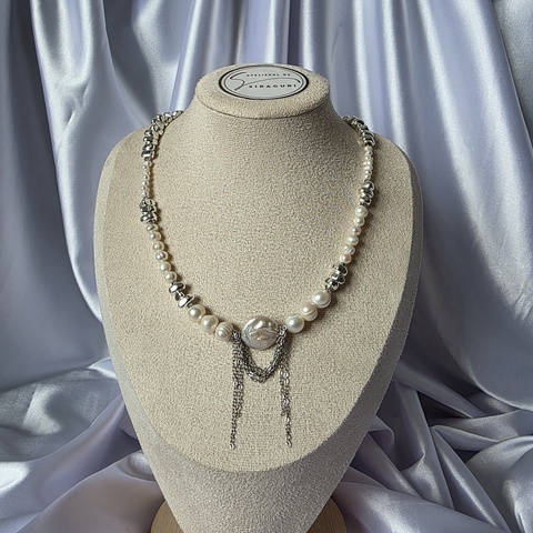 Colier din perle de cultură și hematit cu lanț din oțel inoxidabil