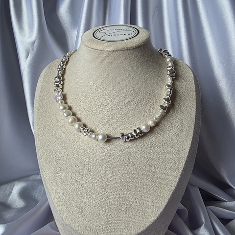 Colier din perle de cultură și hematite, cu lanț din oțel inoxidabil.