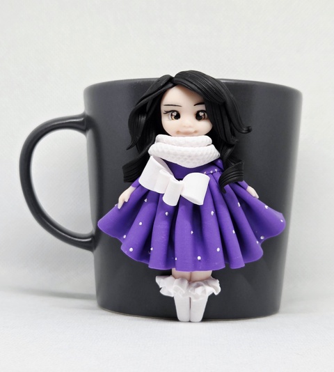 Cană personalizată, handmade, cu fetiță în rochie mov – decor 3D din lut polimeric (FIMO), 300 ml