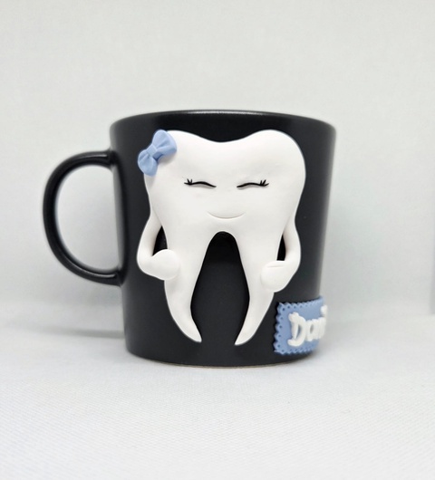Cană personalizată, handmade, cu dințișor – decor 3D din lut polimeric (FIMO), 300 ml