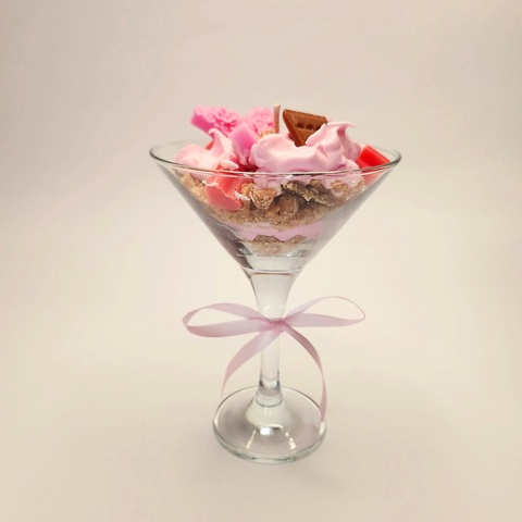 - Material/Conținut ceara soia, ceara palmier, fitil bumbac, esența pudding, esența french vanilla, pahar martini, sacoșă cu fereastră transparentă