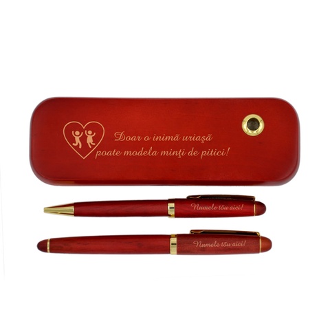 Set pix si stilou in cutie din lemn de trandafir, Piksel, cadou personalizat, invatator, educator