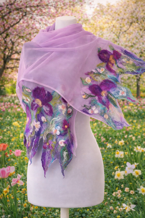 Eșarfă de mătase naturala împaslita cu flori de lana merinos