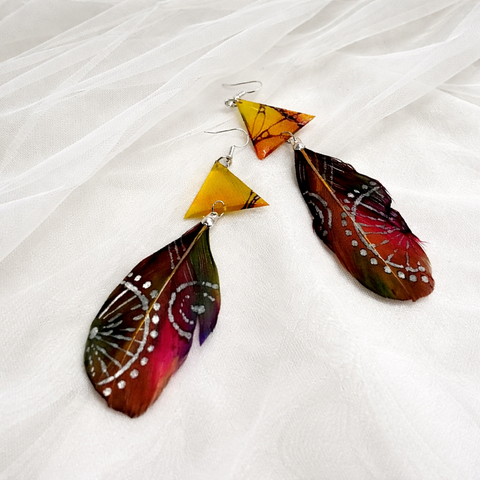 Cercei handmade cu pene naturale pictate manual 01982