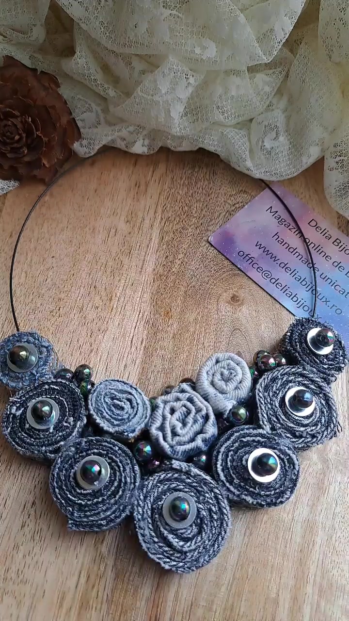 - Material/Conținut baza colier, blug, denim, inchidere filet, reciclat, upcycle, jeans, blugi, margele, plastic