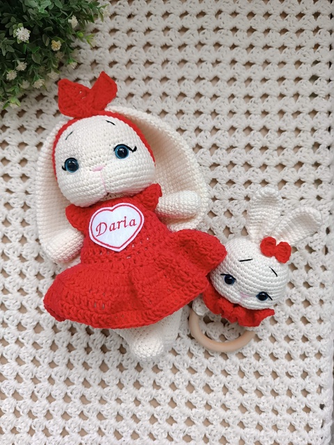 Set cadou pentru bebeluși - Iepurași croșetați manual, cu rochiță și jucărie senzorială roșu