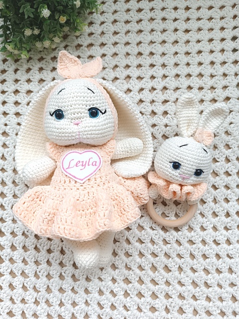 Set cadou pentru bebeluși - Iepurași croșetați manual, cu rochiță și jucărie senzorială crem