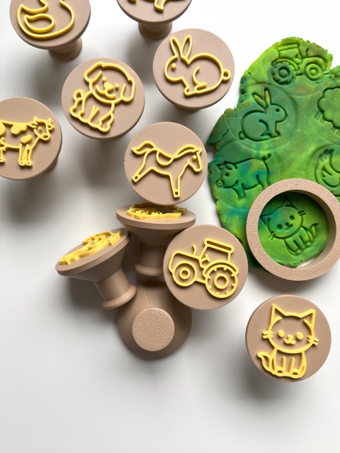 vacă, purceluș, miel, rață, găină, câine, pisică, iepuraș, cal, tractor, hambar (barn) și alte motive de fermă. Avantaje principale: Modele detaliate, realiste – lasă o amprentă frumoasă și clară atât în plastilină, cât și în aluat
