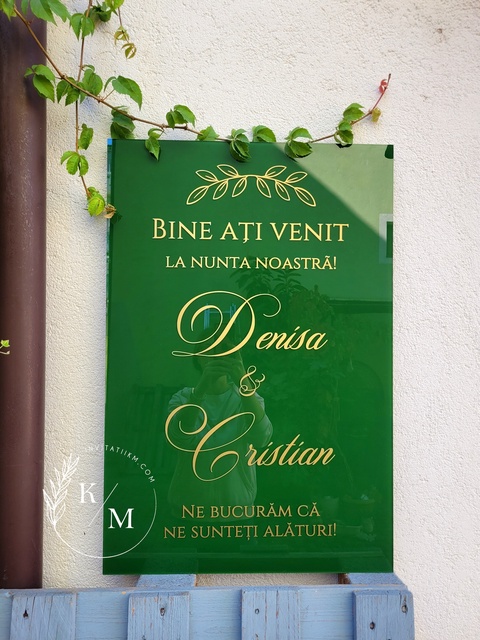 Panou intampinare nunta din plexiglas verde si detalii florale aurii