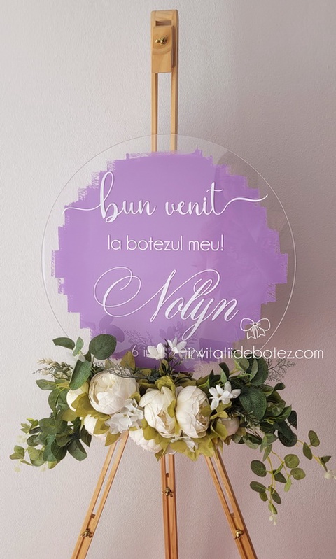 Panou plexiglas rotund de intampinare pentru botez lila si alb