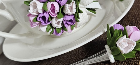 Set decorativ handmade-cana cu buchet de lalele , farfurioara si lingurita asortata