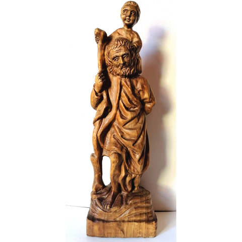 Statuie sculptată vintage a Sfântului Cristofor cu pruncul Iisus la gât