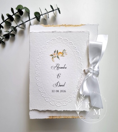 Invitatii de nunta cu margini franjurate, detalii aurii si lamai
