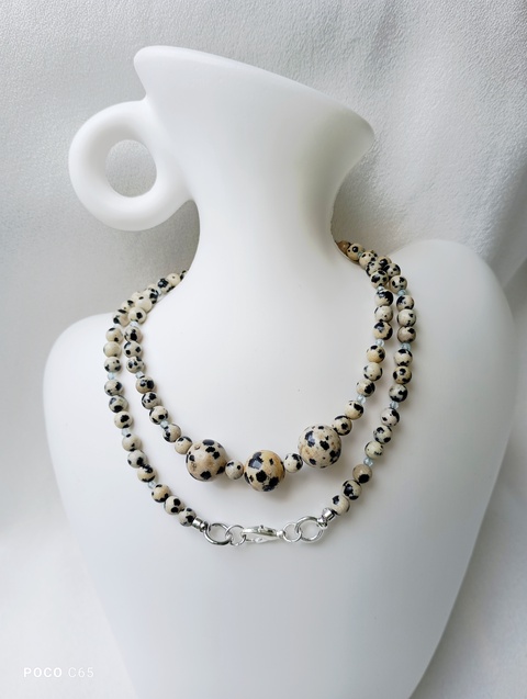 - Material/Conținut jasp dalmatian, topaz, tortite placate cu argint, accesorii metalice