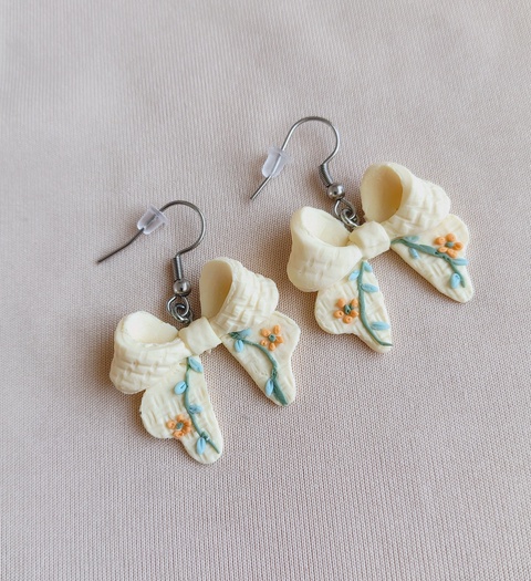 Cercei fundiță din lut polimeric, textură brodată – galben pal