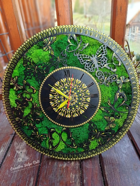 Ceas de perete cu licheni stabilizati și pictură cu techica punctului 40 cm - verde